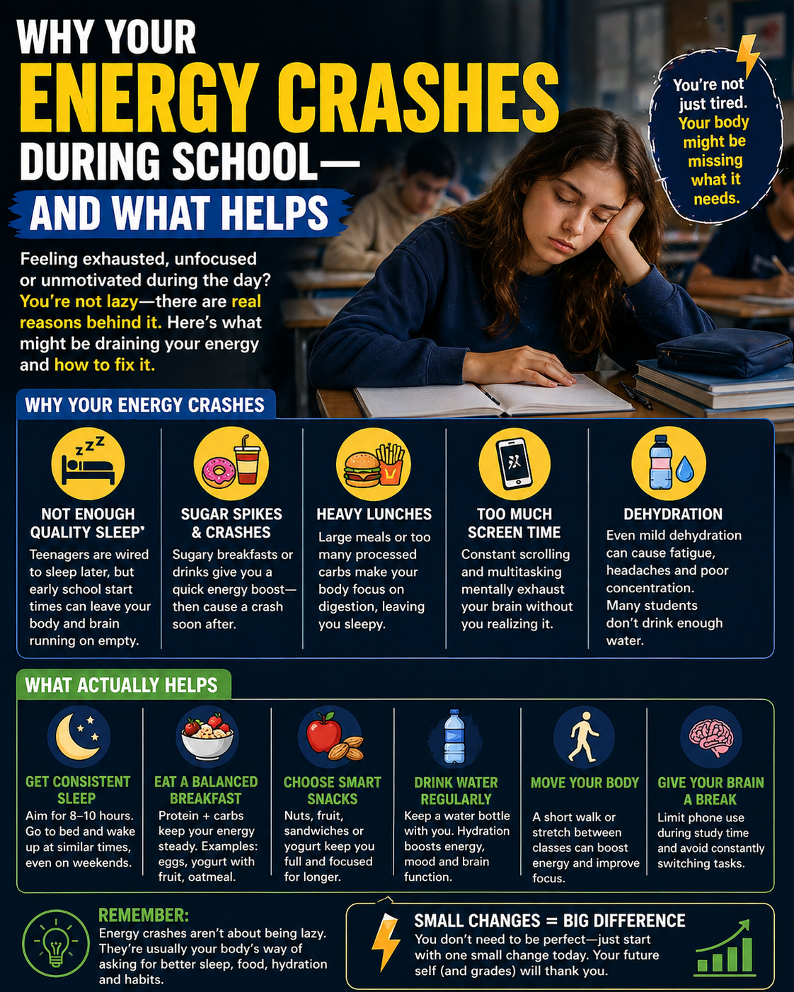 Energy crashes during school are extremely common, especially for teenagers. And while it might feel random, there are actually clear reasons behind it.